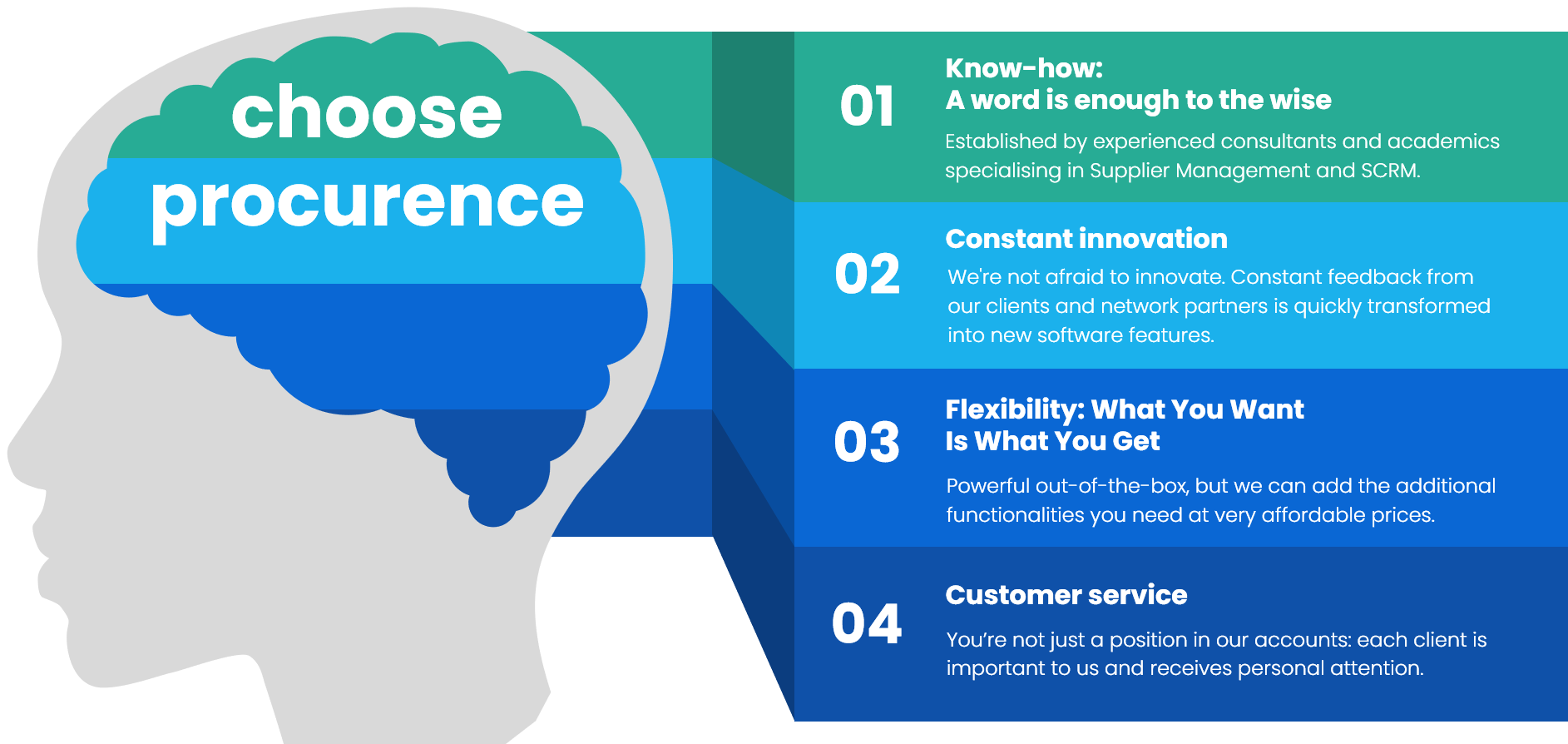 We're a young, innovative company. Unlike our larger competitors, we care about you as a customer: as procurement ex-consultants, we can support you with our business know-how. Finally, although we offer off-the-shelf software, we're very flexible about adding new features for our clients.